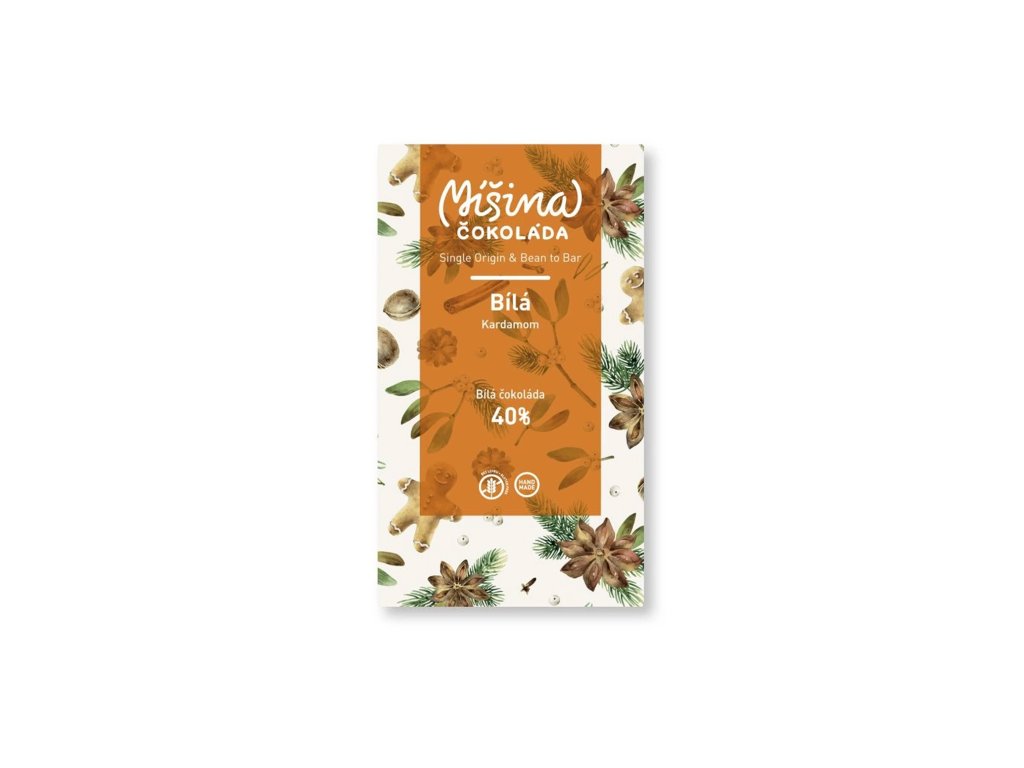 Bílá čokoláda s čerstvě mletým zeleným kardamomem. Základ tvoří vaše oblíbená bílá čokoláda, do které přidáváme toto exotické koření.